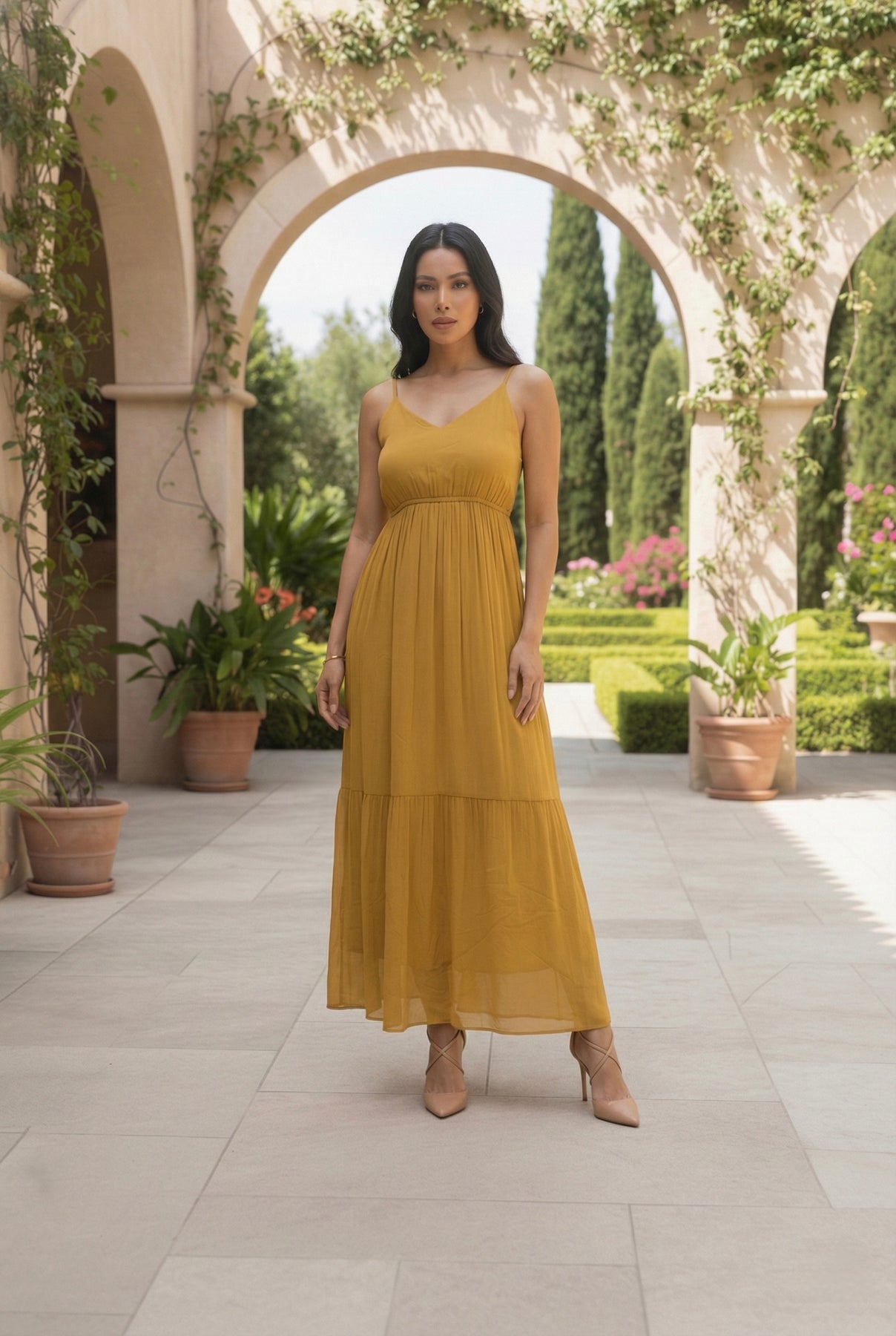 Sunlit elegance meets effortless grace in this flowing mustard yellow maxi dress. Designed for the woman who moves through life with quiet confidence, this piece captures the warmth of golden hour in luxurious fabric that drapes beautifully with every step.