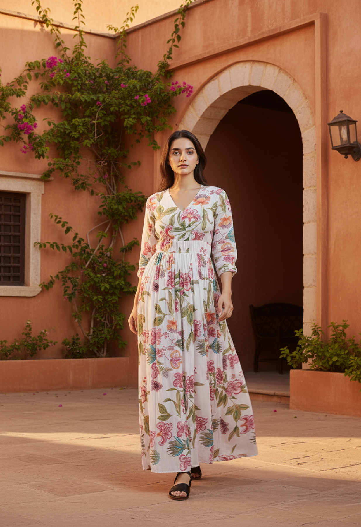 Step into a world of soft elegance with our Romantic Flora Maxi Dress — a delicate blend of florals and flowing fabric that captures the essence of femininity. Crafted from premium georgette with a comfortable inner lining, this dreamy maxi features a graceful silhouette that’s perfect for daytime outings, garden brunches, or vacation escapes.