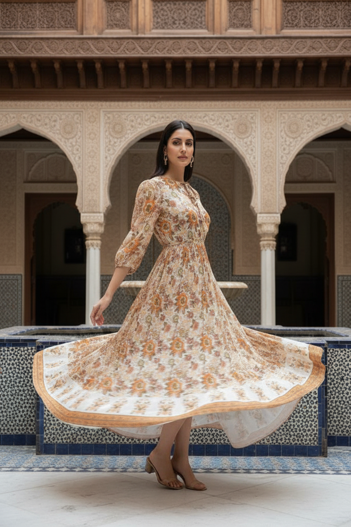 Step into elegance with the Harvest Hues Maxi Dress by Masakali. Crafted from soft, breathable fabric, this dress features a flattering off-shoulder neckline and elbow-length sleeves, offering a blend of comfort and style. The delicate Black floral print makes it a perfect choice for brunches, casual outings, or evening gatherings.