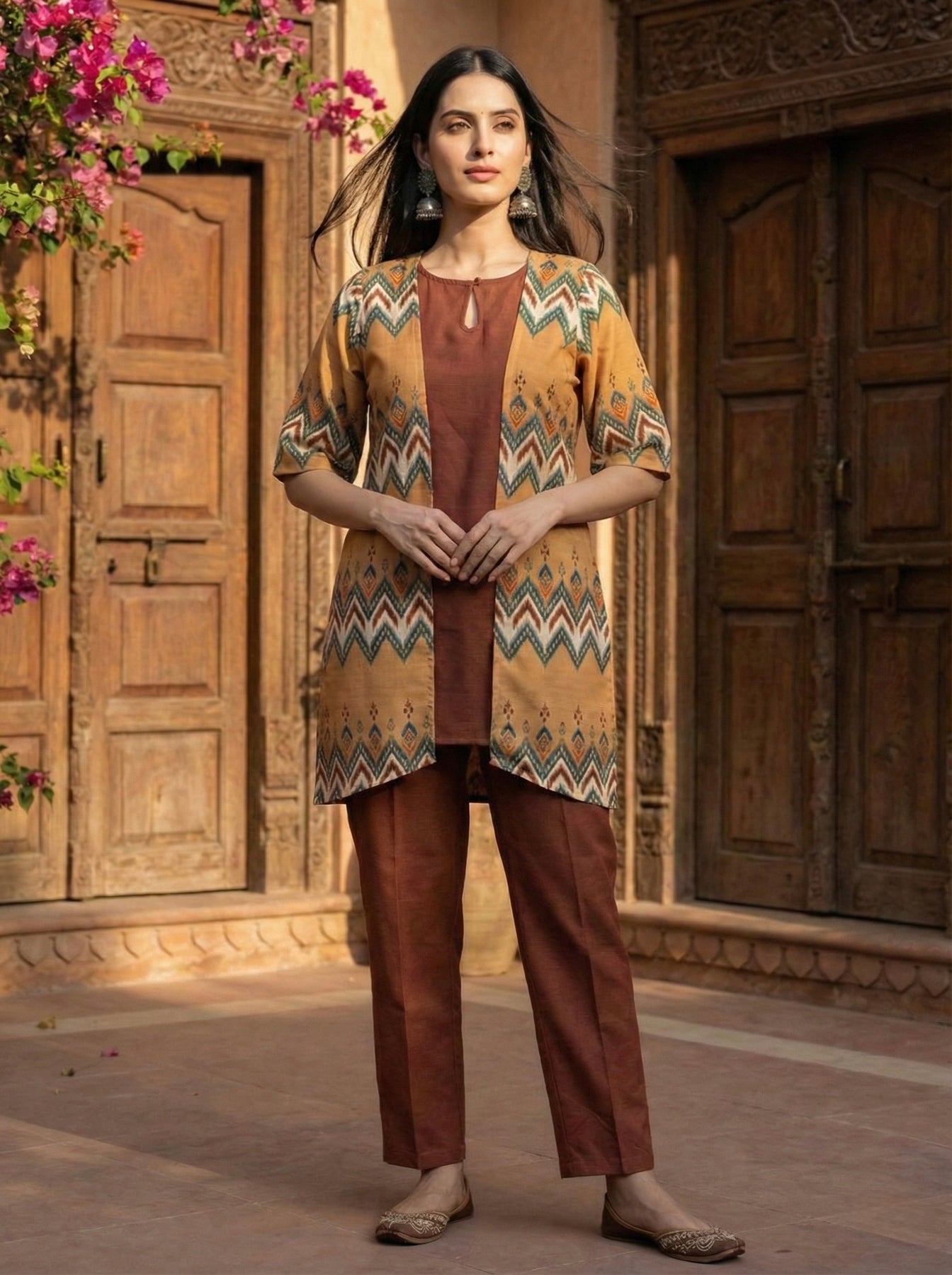A warm, earthy winter ensemble crafted with modern minimalism and Pahadi heritage. The outer cape is made from soft Poly Pashmina with geometric Pahadi-inspired motifs. Paired with a Rayon inner top and straight-fit bottoms, the outfit offers comfort, fluidity, and winter elegance.